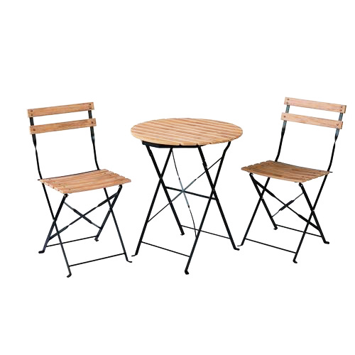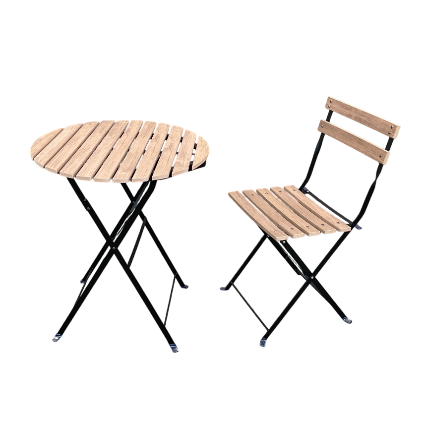 温かみのある天板に、スタイリッシュな黒の鉄製フレームを組み合わせた折りたたみ式テーブルです。伝統的なフランスのカフェスタイルを再現したデザインは、チェアと合わせることで、屋外・屋内を問わず洗練されたテラス空間を演出します。
